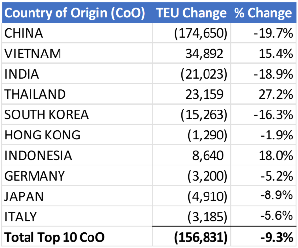 November 2024 to November 2025 (YoY) Comparison of U.S. Import Volumes from Top 10 Countries of Origin