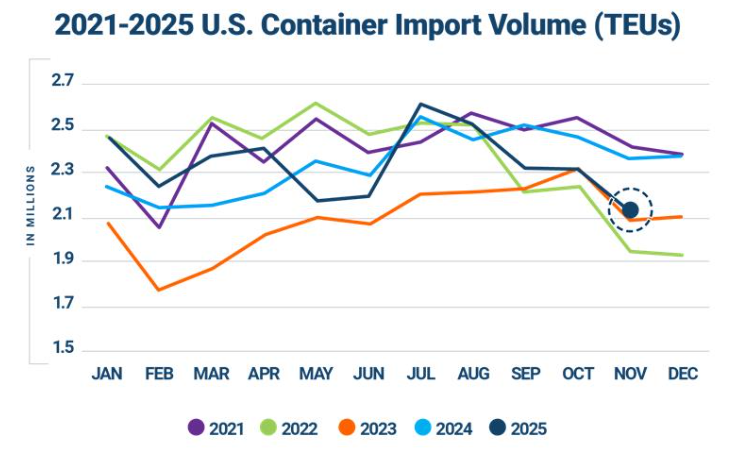 “In November 2025, U.S. container imports totaled 2,183,048 twenty-foot equivalent units (TEUs), declining 5.4% from October in line with the typical month-over-month seasonal drop, November’s shorter month and Thanksgiving-related slowdowns. With a sharp 11.3% decline, China-origin imports were a major driver of November’s overall volume pullback, occurring against a backdrop of ongoing U.S.–China policy adjustments. Port transit delays also edged higher in November, reflecting the seasonal slowdown but not signaling any systemic congestion. Heading into year-end, the legal challenge to Liberation Day tariffs and continued carrier caution in the Red Sea corridor are additional factors contributing to a cautious but steady outlook for U.S. importers.”
